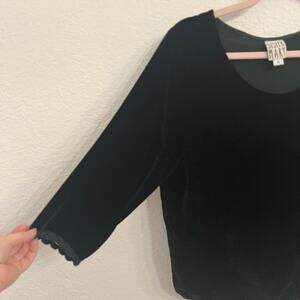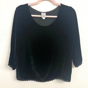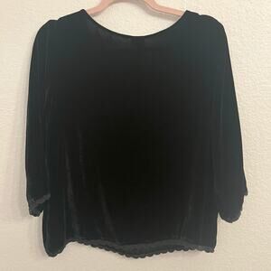 Silk blend velvet makes for a luxurious feel in this 3/4 sleeve blouse with lace trim at the sleeves and hem. Dress it up for a night out or pair it with trousers for the office.