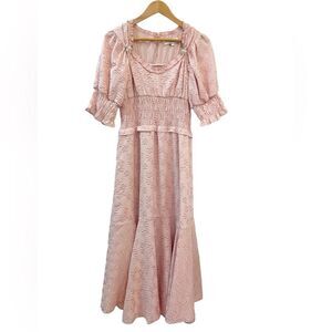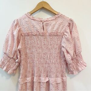 Featuring a fitted waist with shirring details and a ruffle neckline complete with decorative flower gem brooches.