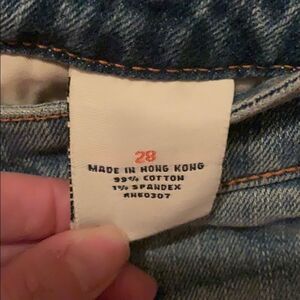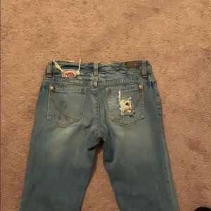 Normal wear, flower patchwork, with fringed and strayed material, bootcut bottoms. Size 28 29” inseam