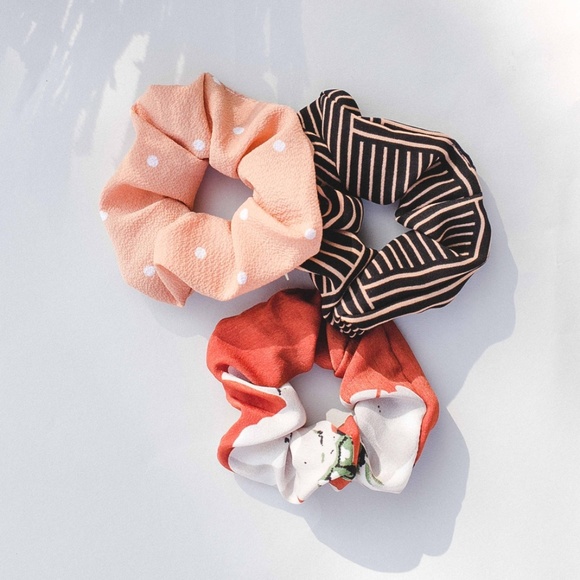 Our Sister's Scrunchie Set comes in and pack of 3 and has a bold coral red, classic polka dots, and a black pattern. Spice up your pony with them or wear one around your wrist with convenience and style!