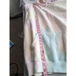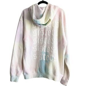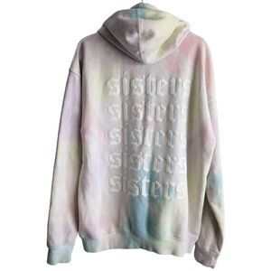 James Charles Sisters By Safety Pin Rainbow Sherbet Pastel Tie Dye Hoodie Soft, fleece lined sweatshirt features kangaroo pocket and rib knit hem and cuffs with white infused "sisters" graphic on front left chest and down the back.Cotton blend no flaws measured as flat lay measurements in photos.