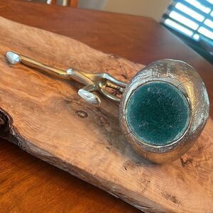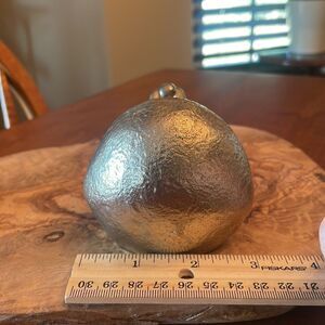 The Rock appears to be crafted of gold-painted metal, with a figural man made out of brass pushing a boulder. It is actually two pieces: the man's hands have ends that fit into holes on the rock. Pieces together measure approximately 6" long and 3" tall.