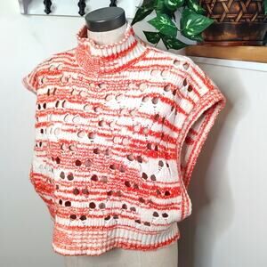 Made in Spain, this unique two-tone sweater vest is a merino wool and cotton blend with a high neck and open knit pattern. Slub-type yard spun in Italy. Stylish open arm fit for a bohemian look. Gorgeous feel and look.