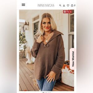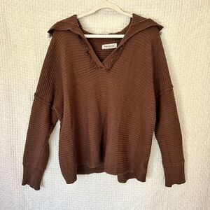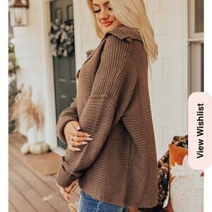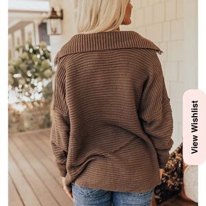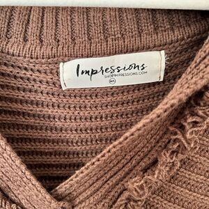 Cozy up by the fire this season in this trendy sweater! - Comfortable mocha colored knit material with ribbed texture - Oversized collared v-neckline with fringe detail - Long loose sleeves with cuffs - Relaxed silhouette that ends in a straight hemline