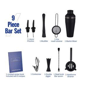 Everything you need:This cocktail shaker can meet all your needs. SIVMIG provides the most basic bar accessories you need: 9-Piece All Dumb black Tool Kit, 18.5 ounce Cobbler shaker, mojito muddler, mixing spoon, double-jigger , 2 liqour pourers, Strainer, corkscrew, hawthorne Strainer.BONUS: a cute pocket booklet with yummy cocktail recipes.