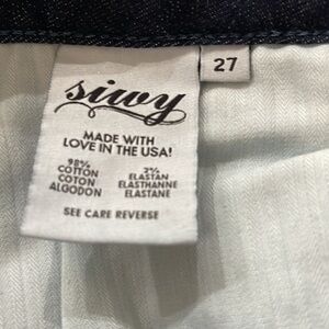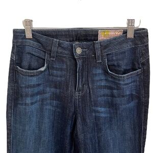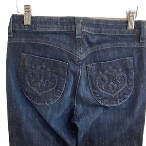 Distress washed bootcut jean 4 pocket style Zip fly Embroidered logo back pockets Waist 28” Rise 9” Inseam 34”