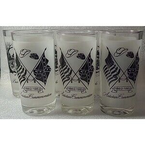 The product is a set of six commemorative glasses celebrating the Civil War, specifically the Battle of Antietam and the Burnside Bridge. Made in the United States in 1962, these glasses are a piece of Militaria memorabilia that pays tribute to a significant event in American history. Perfect for collectors or enthusiasts of Civil War artifacts, these glasses serve as a unique and tangible link to the past.
