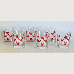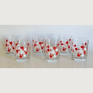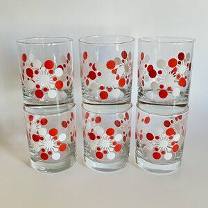 Great Set of Six (6) Crate & Barrel Atomic Red & White Snowflake Double Old Fashioned Holiday Winter Christmas Cocktail Glasses in very good preowned condition. Each measures approx: 4" tall x 3 1/4" in diameter with 12 oz capacity. Mid Century Modern Retro Style!