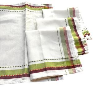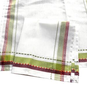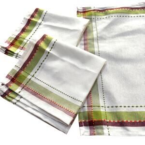 Set of (6) Six Cotton Cloth Napkins - a charming set done in a Country Cabin / Farmhouse casual style. Creamy white with a green / red / orange woven plaid border design. Simple and versatile - these will work as well for a holiday meal as they will for a relaxed picnic. No tags but these feel like cotton or a cotton blend - pre-owned but possibly never used - clear, fresh and ready to use!