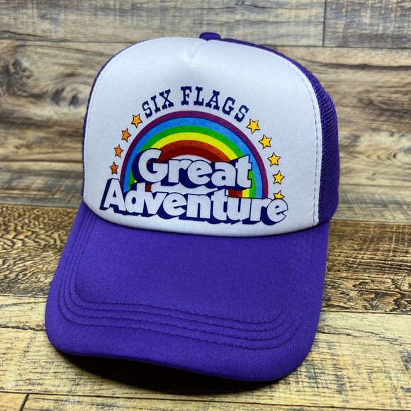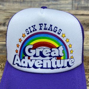 Six Flags Great Adventure Mens Trucker Hat Purple Snapback Theme Park Ball Cap