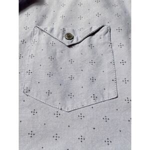 This stylish Six Lincoln short sleeve button-up shirt in light blue features a subtle all-over geometric print, a front pocket with button closure, and a relaxed yet refined look. Crafted from a breathable cotton-poly blend, this medium-weight shirt is perfect for warmer weather and casual to semi-dressy occasions. The contrast inner collar and inner placket details add a touch of visual interest.
