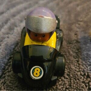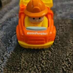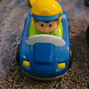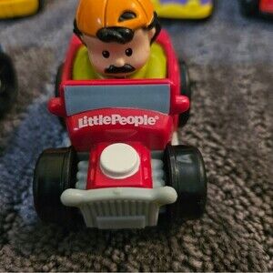 six Little People vehicles, including a construction truck, a race car, and more. normal wear and tare as shown in the pictures. purple, red, blue'orange, black, and yellow.
