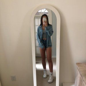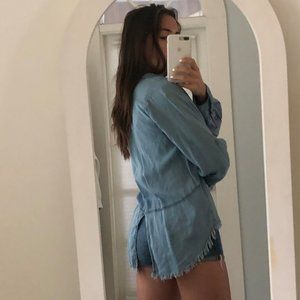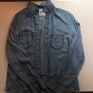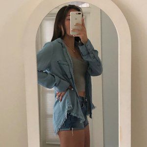 meant to look like a jean jacket but made of thin lightweight material, button-down, pockets are real
