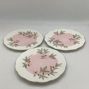 Six elegant bone china Braemar plates by Royal Albert. Features gold detailing, pink center and pine cone design.