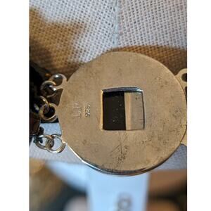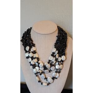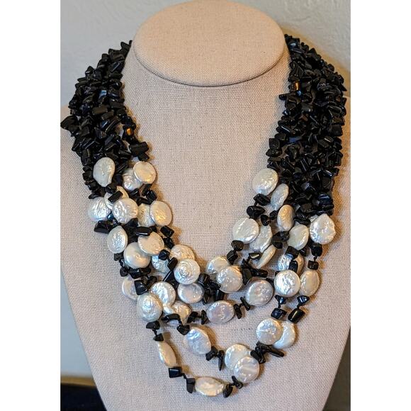 Six Strand White Coin Pearl Black Onyx Chip Sterling Slide In Clasp Necklace. Pre-owned, this necklace is in excellent condition. A substantial statement piece. Signed by Designer LP 925 Sterling Silver.