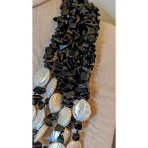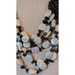 Six Strand White Coin Pearl Black Onyx Chip Sterling Slide In Clasp Necklace