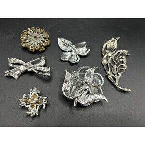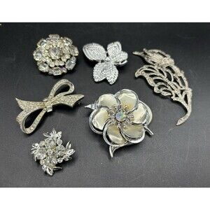 This is a lot of six vintage brooches, consisting of clear rhinestones and or silvertone metal. One of the brooches is marked Gerry, while the others are unmarked. The brooches are all working and are in pre-owned condition.