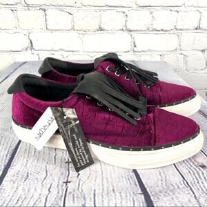 An unconventional pair of shoes inspired by the world and made in Spain. Sneakers with Croc textured velvet, Removable leather fringe, metal bead detailing. Gorgeous wine color.