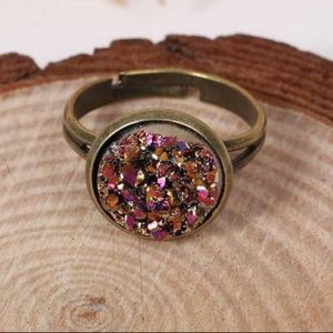 Gorgeous adjustable cocktail ring. Made out of metal alloy, nickel and lead free. Setting is antique gold colored. Center stone is 1/2 an inch in diameter. Stone is a synthetic druzy quartz imitation that has plenty of sparkle