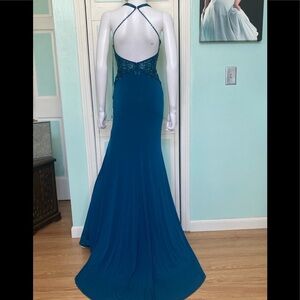 Size 0 Clarisse 8064 Peacock Teal Open Back Side Slit Dress Prom Gown NWT