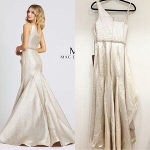 Size 0 Mac Duggal Champagne Gold One Shoulder Metallic Ruffled Gown Prom Dress