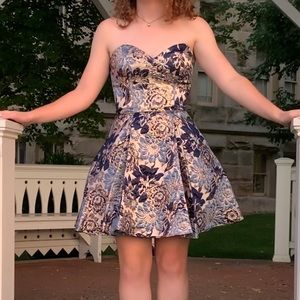This dress has only been worn once and is in perfect condition. I wore if for my senior homecoming but it can be worn for other formal occasions as well. It is a stunning dress full of golds and blues and it even comes with pockets! It is a size one and fits like a glove! It is strapless but has two mini straps for hanging in the closet. This dress is a perfect formal dress!