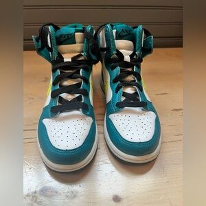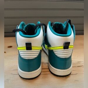Stylish and comfortable, these Nike high-top sneakers for kids feature a vibrant teal and neon yellow design. Perfect for active days and casual outings.