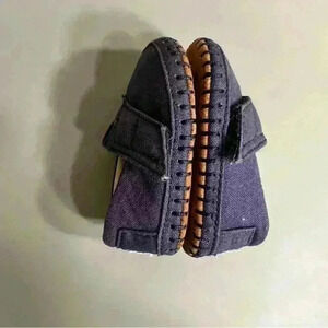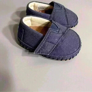 Size 1 baby boy crib flats Toms navy and tan Velcro strap moccasins no flaws