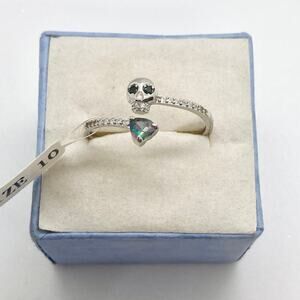 Size 10. Sterling silver open skull and heart ring. The focal point is a tiny skull with black gems in its eyes and an upside down heart indent as its nose at one end and a heart shaped rainbow topaz at the other end, with 8 tiny CZ crystals on either side running down the band.