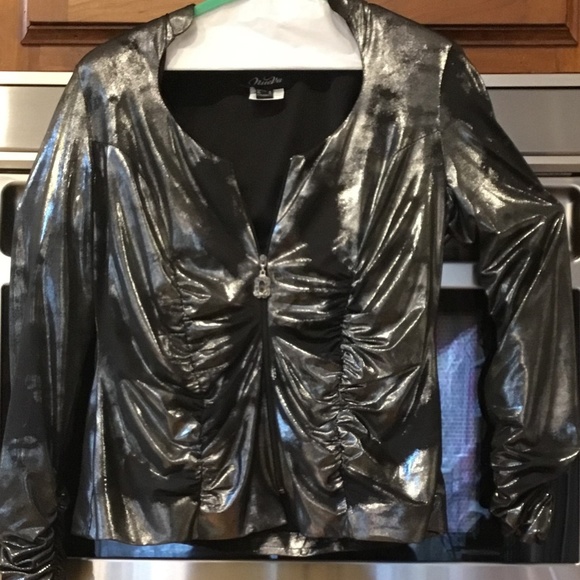 Black metallic zip up jacket with full length cinched up sleeves. Shoulder pads.