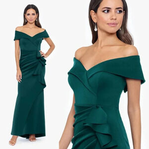 NWOT (new without tags, never washed or worn) - Upgrade your wardrobe with the "Patti" Long Off the Shoulder Scuba Crepe Dress. Made from high-quality Scuba Crepe material and fully lined for comfort, this dress features a hidden back zipper for a seamless finish. The off the shoulder design, folded top, and ruffle detail add a touch of elegance and sophistication to any occasion.