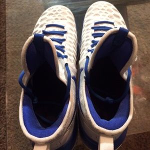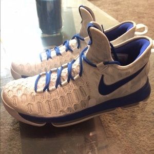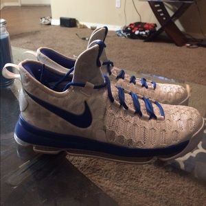 I have a pair of Custom KD 9s. Size 10. I got them In a trade and they're unfortunately too small for me. They are white, with blue accents and subtle stars across the shoe. They're in immaculate condition, and have maybe been worn a few times. They are custom made and go for $195 brand new. Great shoe to wear or hoop in. Price is obo