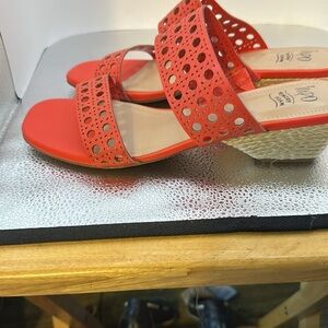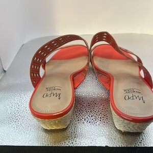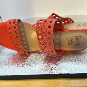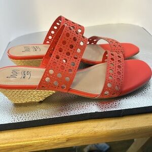 IMP0 memory foam. New without tags Cute sandals with straw like material on the top of the heel. A beautiful dark peach color color. 10 medium I did notice on each heel. There’s a little white mark in the same place so I’m not sure if that’s supposed to be there or not, but I took a picture.