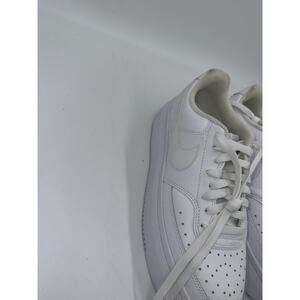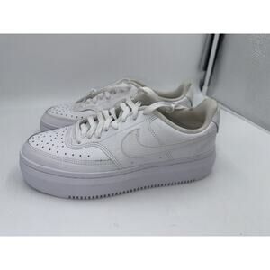 The product is a pair of Nike Court Vision Alta Triple White sneakers in size 10.5. These athletic shoes are designed for women and feature a leather upper material in a stylish triple white colorway. Released in 2021 as part of the Nike Court product line, these sneakers belong to the Court Vision model and have the style code DM0113-100. With their sleek design and quality construction, these Nike sneakers are a fashionable and versatile choice for everyday wear or athletic activities.