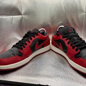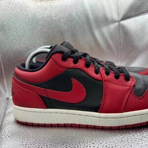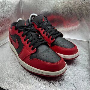 The product is a Nike Air Jordan 1 Low Reverse Bred Red Black Men's Sneaker in size 11.5. This sneaker features a lace-up closure, rubber outsole, and leather upper material. It offers arch support, cushioning, and comfort, making it suitable for activewear and casual occasions throughout all seasons. The colorblock pattern in red and black with a low-top shoe shaft style gives a retro and sporty vibe, stylish for athletic wear. This sneaker is part of the Air Jordan product line and is a great choice for those looking for both fashion and function in their footwear.