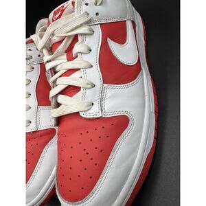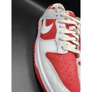 The product is a pair of Nike Dunk Low Championship Red sneakers in size 11.5. These athletic shoes feature a low top design, a striking red colorway, and are part of the Nike Dunk product line. Made with leather material, these sneakers are designed specifically for men and were released in 2021. With a style code of DD1391-600 and a country of manufacture in Indonesia, these sneakers combine style and performance for the modern athlete.