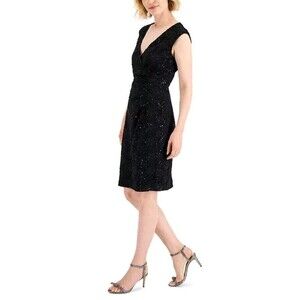 Beautiful sleeveless cocktail party dress with a v-neckline and a faux-wrap design. It is knee-length and features a sequined floral lace overlay.