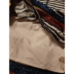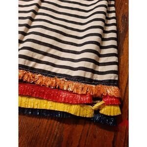 Good Used Condition Women's Size 12 Nicole Miller New York Sleeveless Off White and Black Striped with Orange, Red, Yellow, and Blue Raffia Layered Trim Fringe (Has a Plastic Feel to the Fringe) Rear Zipper Lined Mini Dress