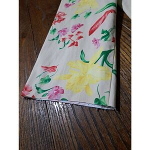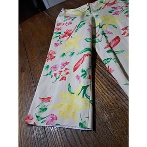This is a Size 12 Rafaella Cream Yellow Red Pink Green Tropical Floral Print Pants that Someone Tried to Turn into Capris- BUT they Need an Inner Button and Need to Be Hemmed
