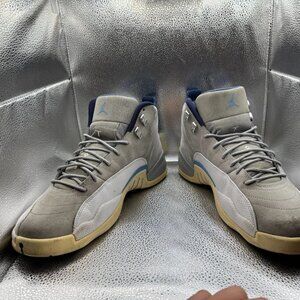The product is a pair of Mens Size 12.5 Jordan 12 Retro Grey University Blue Mid Top Sneakers, featuring a solid color pattern with a lace-up closure. These athletic shoes are part of the Air Jordan product line, specifically the Air Jordan 12 model, released in 2016 and designed for basketball performance. The sneakers offer comfort and are suitable for various occasions, including activewear for both men and the brand Jordan. With a retro theme and classic style, these sneakers are a popular choice for those looking for a stylish and functional footwear option.