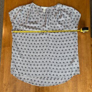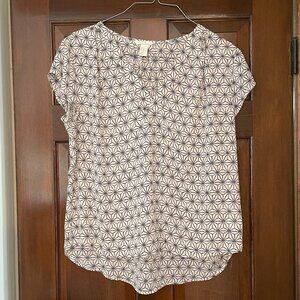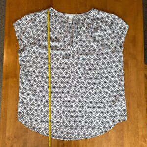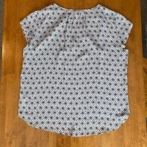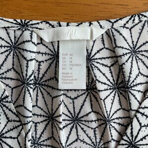 Size 14 H&M black white cap sleeve top. The perfect work/office blouse! Silky, flowy material with V-neck, pleats in back and cap sleeves. Pairs nicely with pants or skirts and can be dressed up or down.