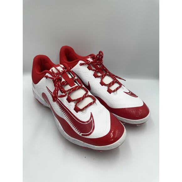 The product is a pair of size 14 men's Nike baseball cleats from the Alpha Huarache Elite 4 Low line. These cleats feature a white and University Red color scheme, medium width, and are part of the FD2745-109 unit quantity. Designed specifically for baseball and softball, these cleats are known for their quality and performance on the field. Perfect for players looking for a reliable and stylish option in footwear.
