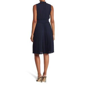 The smocked waist lends a blouson silhouette to this chic dress designed in a pleated finish.