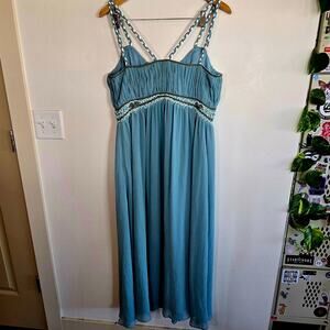 Channel your inner goddess in this stunning seafoam green Grecian-style gown from The Look Luxe by Randolph Duke. This vintage 90s/early 2000s dress features intricate panel stitching, braided double straps in blue and white, and an elegant empire cut. Made of a shiny polyester with a soft drape and a full maxi length, this dress is perfect for formal events, homecoming, or cosplay. Side zipper, fully lined, and in pristine condition.