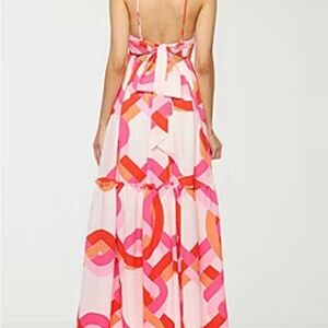 Vibrant pink and orange maxi dress with a stylish geometric pattern. Perfect for summer outings and casual gatherings.