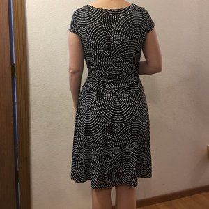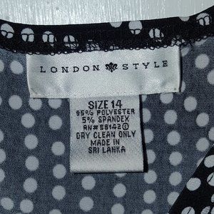 Very flattering and mesmerizing black and white polka dot dress. It fit amazing when I wore a size 16-18 and still fits me now that I'm a size 8-10. Very stretchy, non-wrinkly fabric with an amazing shirred waist. Made of 95% polyester, 5% spandex. I have too many clothes and my closet won't let me keep it! I'm 5'8" tall and the skirt falls right at my knee.
