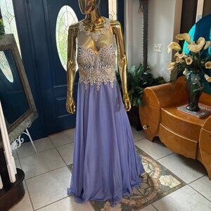 Size 16 Blue Beaded Evening Gown Illusion Halter Formal Dress NWT