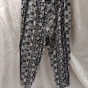 Cute black and white geometric design with solid black sides, elastic waistband, drawstring closure, with side pockets.