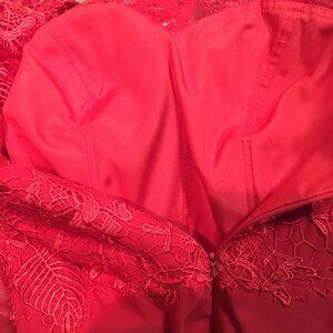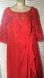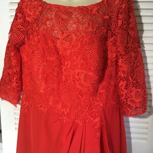 This size 16 chiffon long evening dress is a formal gown in a true red color with a ovalneckline and elbow-length sleeves. The dress features a padded chest and has a zip closure. It is made from polyester fabric with a chiffon type and has a garment care instruction of dry clean only. Perfect for various occasions including  weddings, parties,  and more, this gown is designed for women who wear regular size and prefer a gown style.
