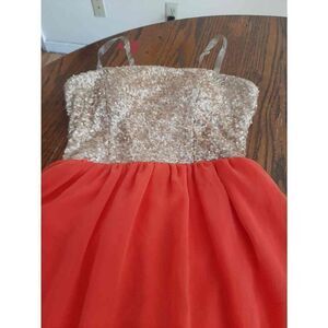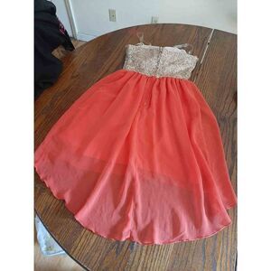 Good Used Condition (1 Fabric Snag Towards the Waist Where the Flow Starts- Please See Pictures) Size 1 Jodi Kristopher Orange and Gold High Low (Designed as a Strapless Dress but Someone has hand sewn in Clear Straps- Which Could Easily Be Removed) Mini Dress- Perfect for Party, Holidays, Christmas, New Years, Prom, Homecoming, Dance